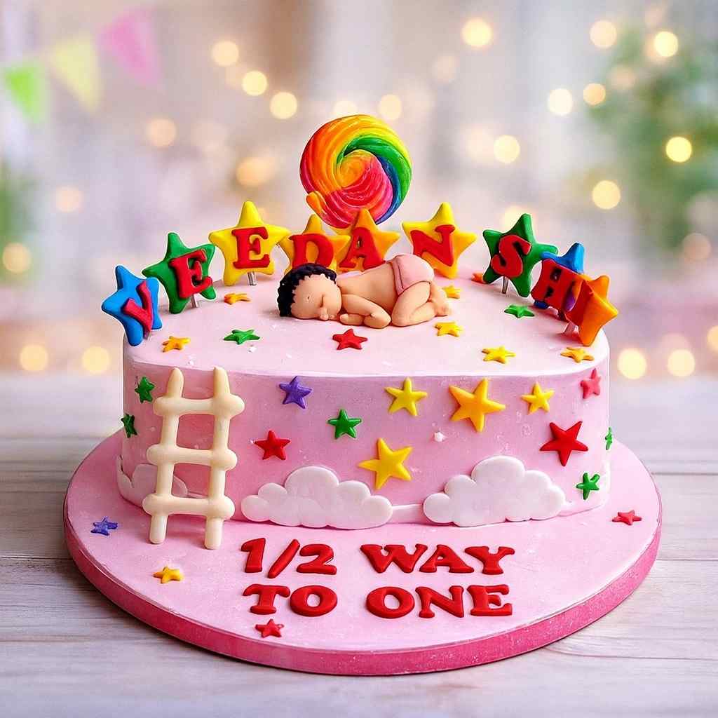 Celebrate your little one’s adorable milestone with this charming Half Birthday Theme Cake! Set in a dreamy pink theme, the cake features a cute sleeping baby topper surrounded by colorful fondant stars. A big rainbow swirl lollipop adds a fun, playful touch, while fluffy clouds and tiny stars decorate the sides, giving it a magical sky-like look.